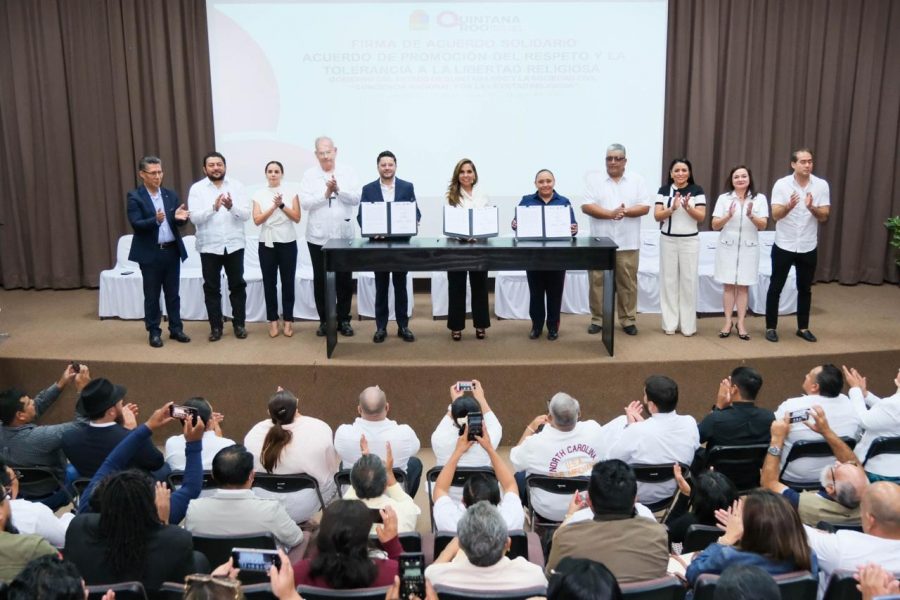 CANCÚN.- En un momento histórico para Quintana Roo, la gobernadora Mara Lezama Espinosa, el sector religioso del estado y la Fundación Conciencia Nacional por la Libertad Religiosa, firmaron un Acuerdo Solidario para la Promoción del Respeto y la Tolerancia Religiosa, además que también se suman a la campaña “Yo sí te creo” para ser un espacio de contención y canalización, así como de promoción de la cultura de la denuncia.