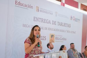 Cancún.- La gobernadora Mara Lezama Espinosa encabezó la conclusión de la entrega de las tarjetas para el pago de la Beca Universal de Educación Básica “Rita Cetina” en el Estado, con la meta de otorgar en total 41 mil 145 programadas para Quintana Roo, en esta ocasión, a aquellos alumnos y alumnas.