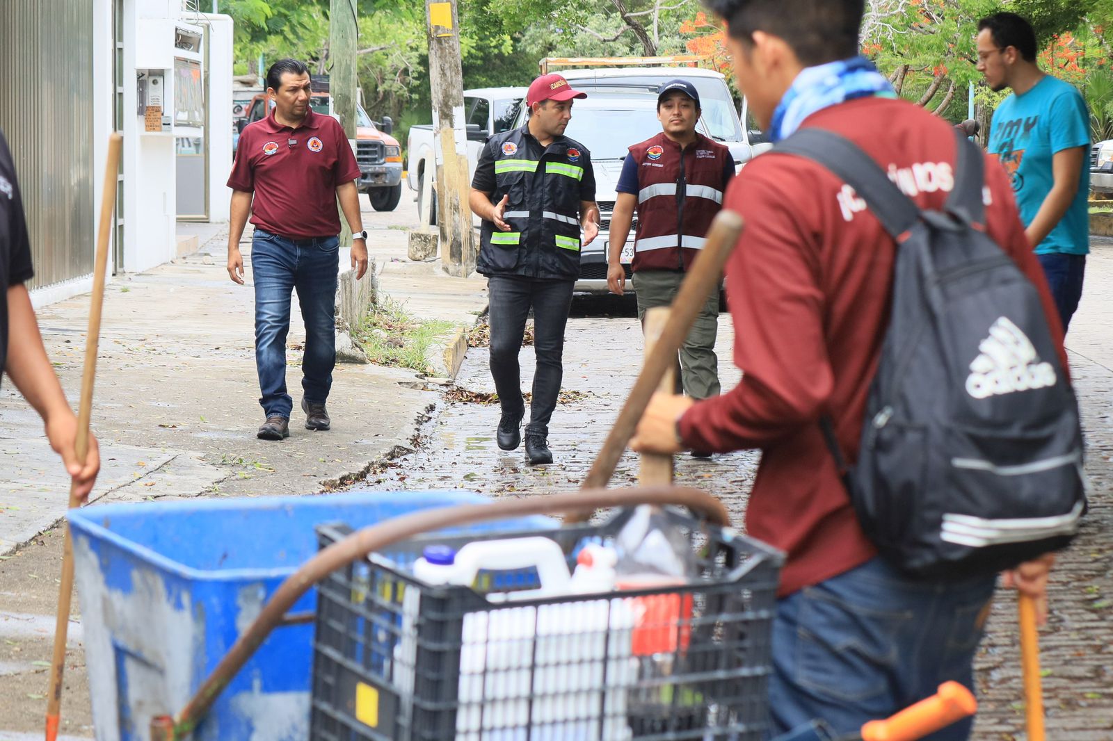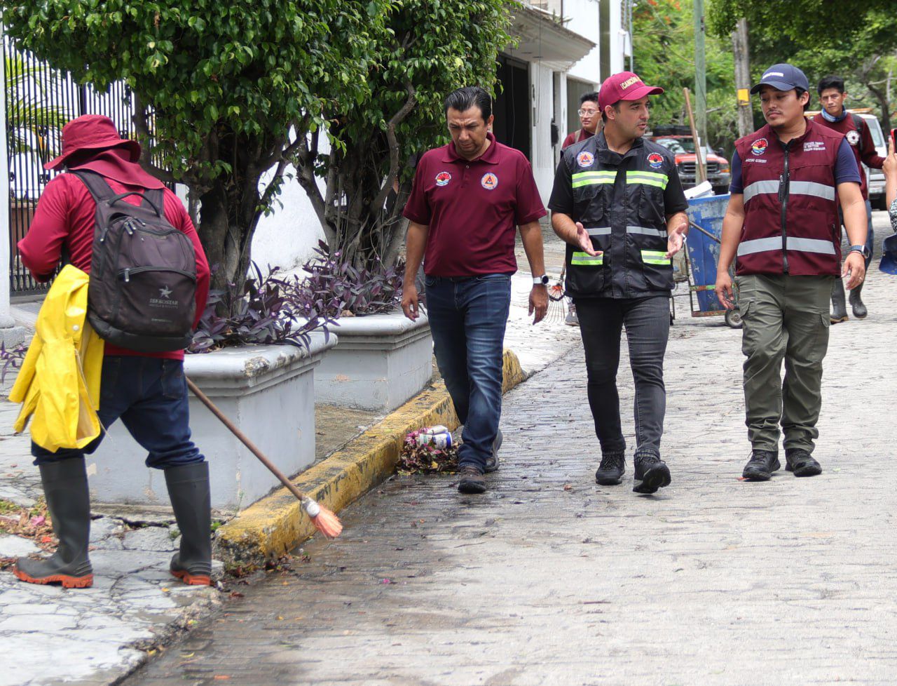 Acompañado por el Secretario General del Ayuntamiento, Antonio Riveroll Ribbón, y el director de Servicios Públicos, Arturo Quintero Díaz, el Encargado de Despacho acudió a la Avenida Las Playas, entre las supermanzanas 29 y 30, donde personal de Servicios Públicos efectuaba el barrido de calles considerado como trabajo preventivo, ya que evita que los residuos sólidos y basura vegetal se acumulen en las alcantarillas que pueden a su vez taparse y obstruir los pozos de absorción.
