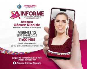 Isla Mujeres,- Con el objetivo de dar a conocer de manera detallada los logros alcanzados por su administración en beneficio de la población isleña, la Presidenta Municipal, Atenea Gómez Ricalde, presentará su Primer Informe de Resultados el próximo viernes 12 de septiembre a las 11:00 horas, en el Domo Bicentenario de la colonia La Gloria.