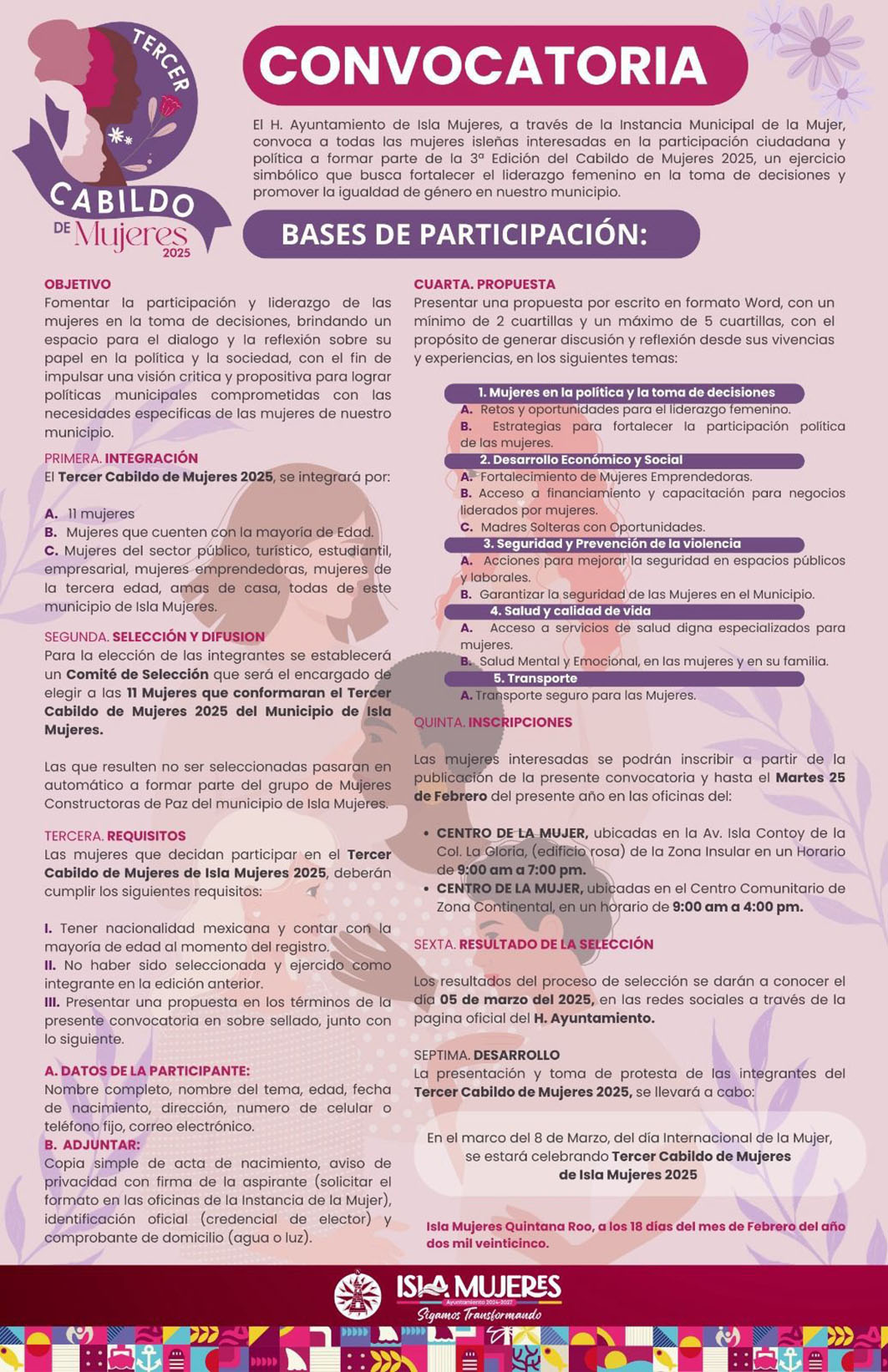 ISLA MUJERES.- Con el objetivo de impulsar la participación femenina en la toma de decisiones y fomentar el liderazgo en distintos ámbitos de la sociedad, el Ayuntamiento de Isla Mujeres, encabezado por la presidenta municipal Atenea Gómez Ricalde, invita a todas las mujeres isleñas a participar en la tercera edición del Cabildo de Mujeres 2025.