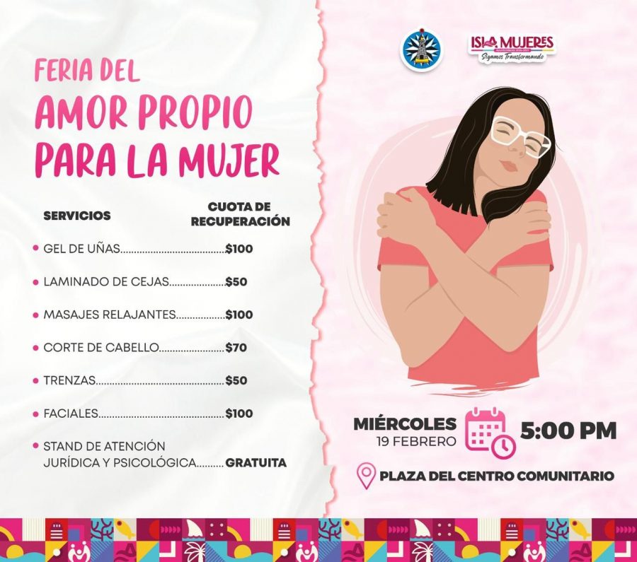 ISLA MUJERES.- Con el compromiso de seguir acercando servicios y oportunidades a las mujeres isleñas, el Ayuntamiento de Isla Mujeres, encabezado por la alcaldesa Atenea Gómez Ricalde, a través de la Instancia Municipal de la Mujer, llevará a cabo la Feria del Amor Propio para la Mujer el próximo miércoles 19 de febrero a las 17:00 horas, en el Centro Comunitario.