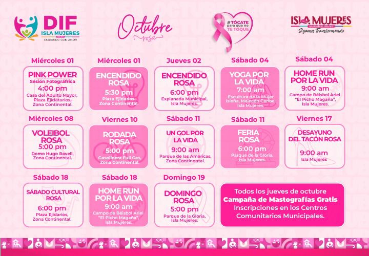 Isla Mujeres.- El Gobierno Municipal que encabeza la alcaldesa Atenea Gómez Ricalde, a través del Sistema para el Desarrollo Integral de la Familia (DIF) Isla Mujeres, anunció una nutrida agenda de actividades en el marco del Mes Rosa, como parte de la Campaña “Tócate para que no te toque”, que busca sensibilizar a la comunidad isleña sobre la importancia que tiene la detección oportuna del cáncer de mama.