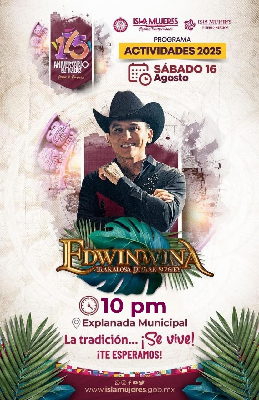 Isla Mujeres.- El Gobierno Municipal que encabeza la alcaldesa Atenea Gómez Ricalde, a través de la Dirección de Cultura, invita a las isleñas e isleños a sumarse a los festejos por el 175 Aniversario de Isla Mujeres, que contarán con la presentación estelar de Edwin Luna y La Trakalosa de Monterrey.