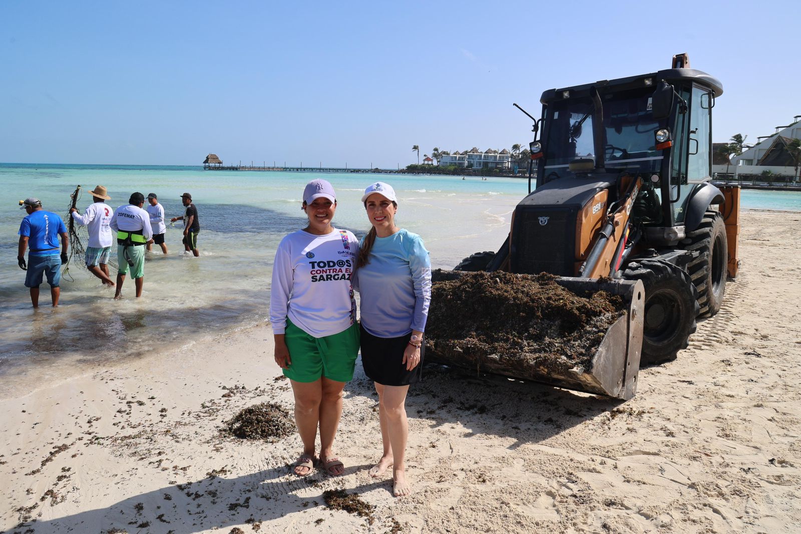 Isla Mujeres.- La presidenta municipal de Isla Mujeres, Atenea Gómez Ricalde, encabezó hoy un recorrido de supervisión en la emblemática Playa Norte para verificar las labores de limpieza tras el inusual recale de sargazo, consecuencia directa del reciente paso del huracán Beryl por las costas quintanarroenses.