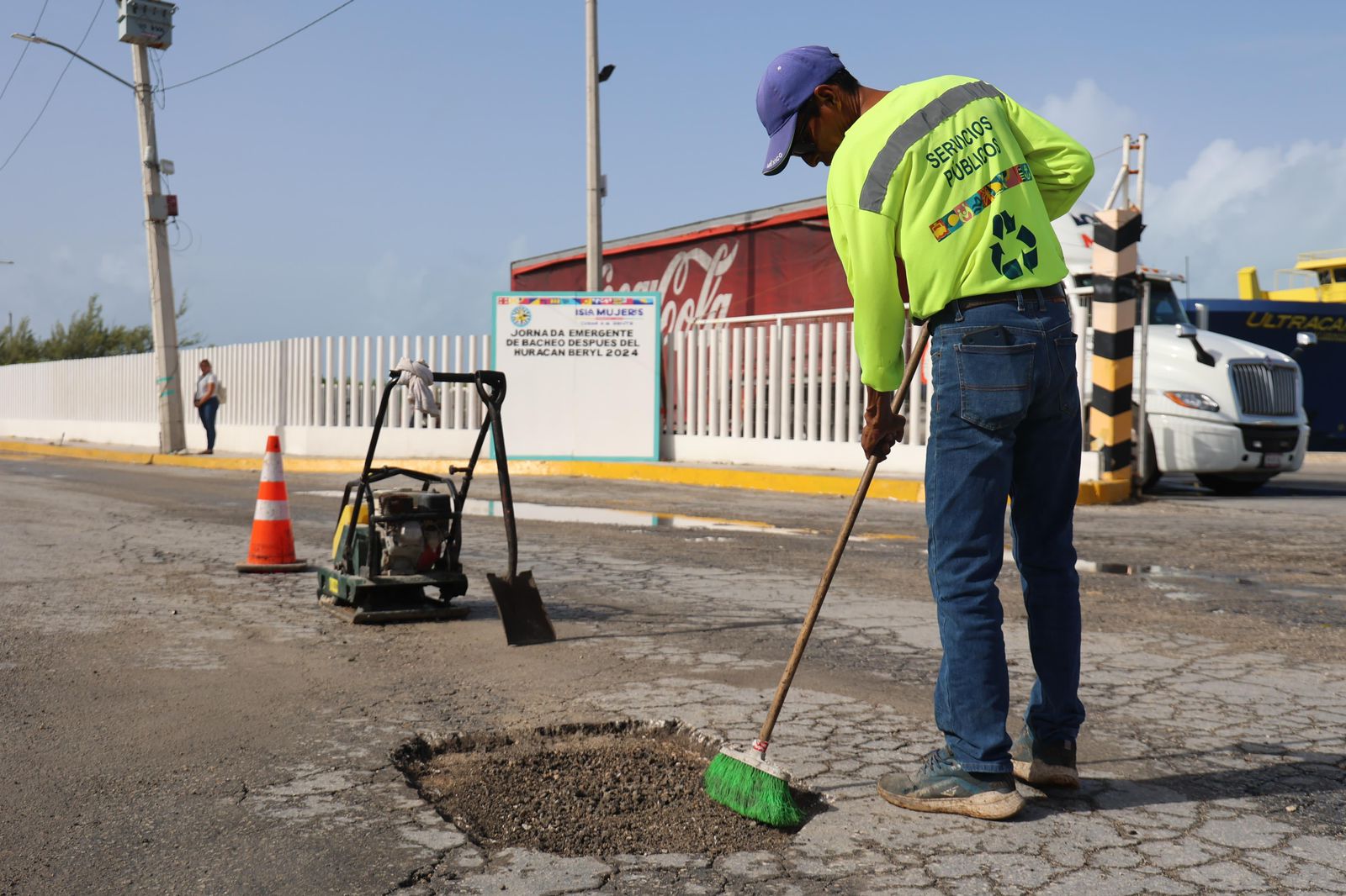 Como parte de la acciones inmediatas después del huracán Beryl, la Dirección General de Servicios Públicos puso en marcha la Jornada Emergente de Bacheo, para atender la avenida principal de la Isla, así como también trabajará en los reportes de la ciudadanía.