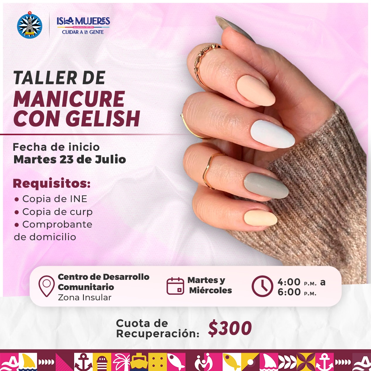 Asimismo, el Taller de Manicure con Gelish iniciará el próximo 23 de julio y se impartirá los martes y miércoles de 4 a 6 de la tarde con una cuota de recuperación de 300 pesos; el Taller de Manualidades para Niños de igual forma comenzará el 23 de julio y se impartirá los martes y jueves de 5 a 7 de la tarde y la cuota de recuperación es de 200 pesos.