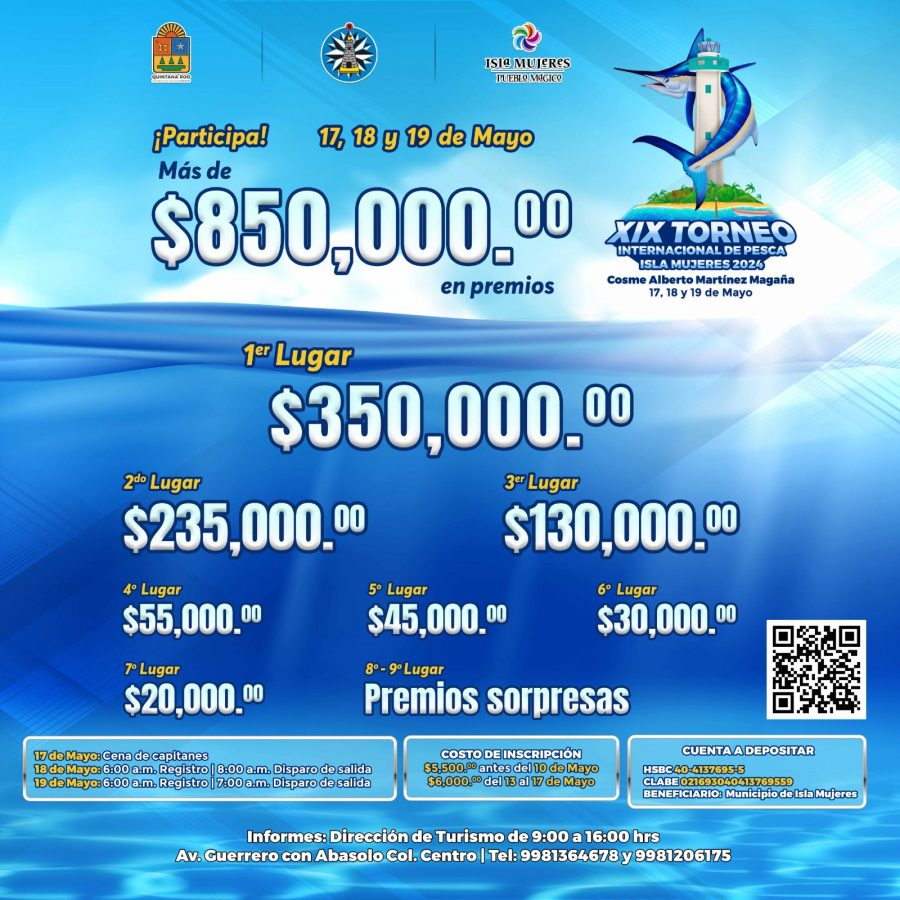 CANCÚN.- Con una bolsa total de más de 850 mil pesos en premios en juego, el Gobierno Municipal de Isla Mujeres mantiene abierta las inscripciones para participar en el XIX Torneo Internacional de Pesca “Cosme Alberto Martínez Magaña”, que se llevará a cabo del 17 al 19 de mayo en Isla Mujeres.