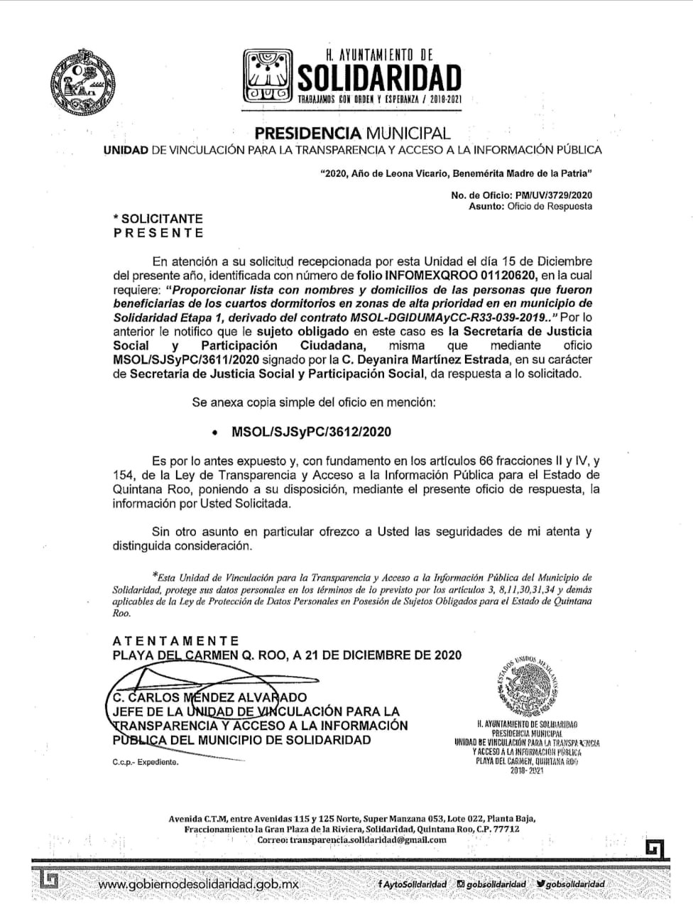 De acuerdo a la lista de beneficiarios proporcionada por la Secretaria de Justicia Social a cargo de la señora Deyanira Martínez Estrada, a través de la solicitud de información INFOMEXQROO 01120620, se pudieron detectar graves anomalías como el “cuarto” asignado al señor José Gonzalo García León, ubicado en la Calle 1 Sur Manzana 60 Lote 10, entre las avenidas 85 y 90, colonia Ejidal, Playa del Carmen, zona que no está dentro de la “Declaratoria de las Zonas de Atención Prioritaria para el año 2019”, que fue publicada en el Diario Oficial de la Federación el 28 de diciembre del 2018.