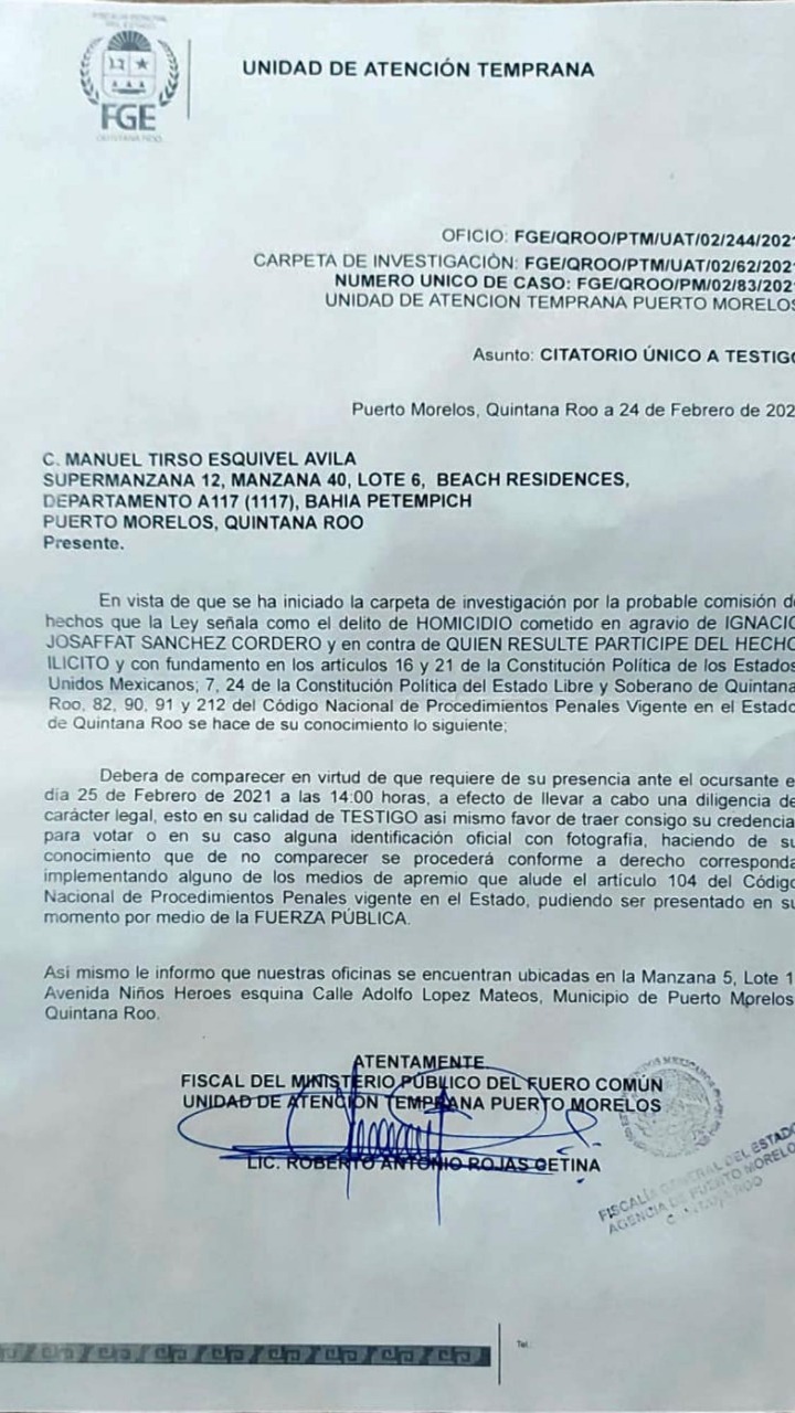 Esquivel Ávila pidió la intervención del gobernador Carlos Joaquín González y del titular de la Fiscalía General del Estado (FGE), para esclarecer los hechos que lo vinculan con este homicidio, además de pedir que se llegue al fondo del tema para esclarecer otros casos que están relacionados a la ejecución “Nacho Sánchez”, suscitados en meses anteriores y que han generado un clima de miedo entre la población de Puerto Morelos.