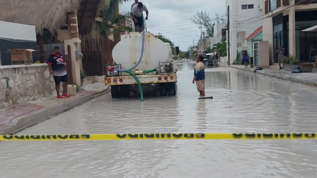 Desaguan calles encharcadas por torrenciales lluvias en Holbox.