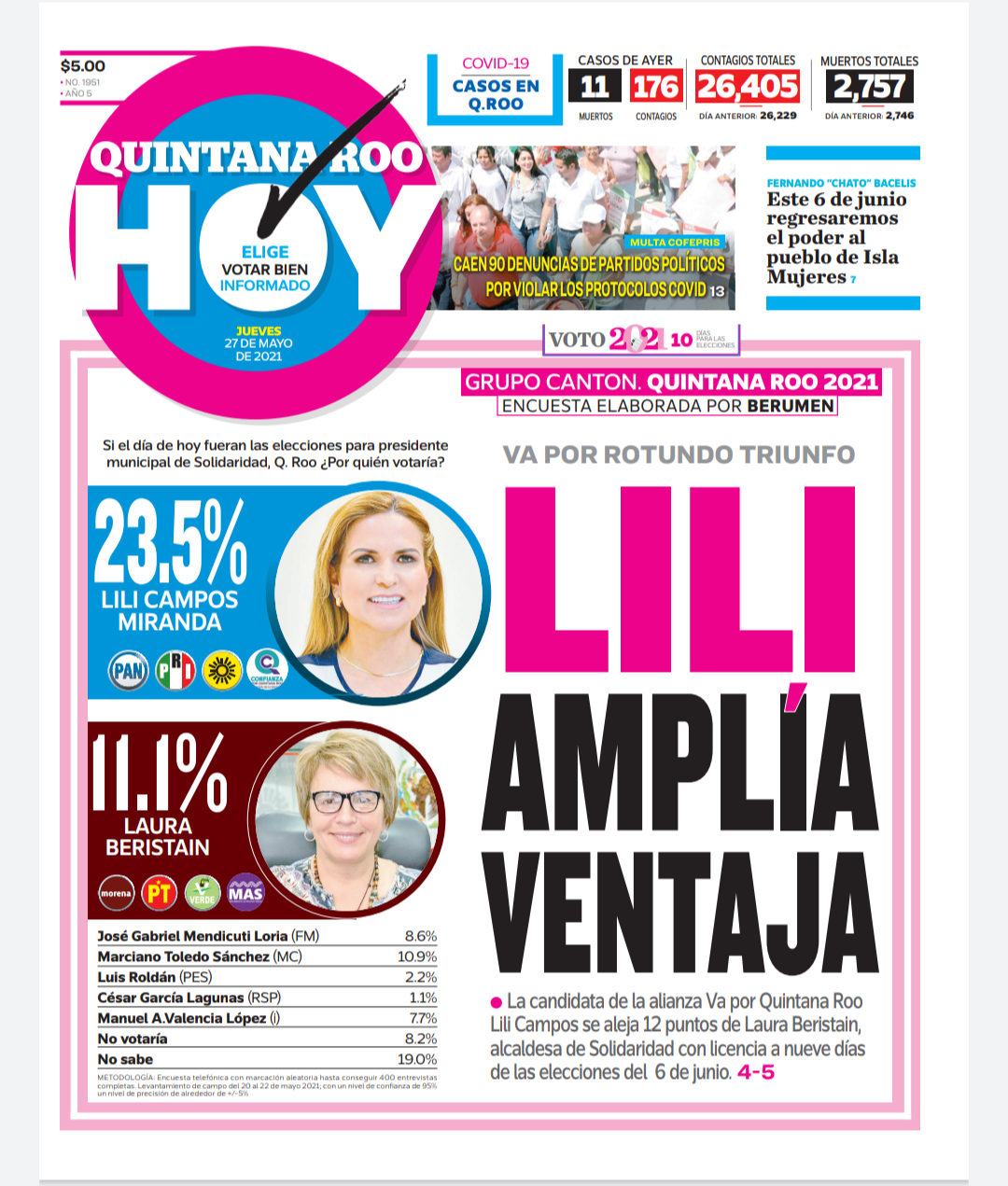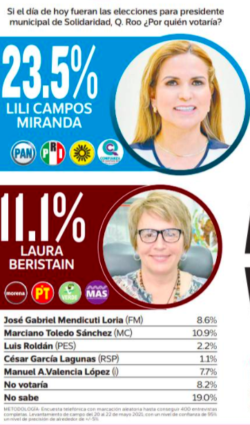 La candidata de la alianza Va por Quintana Roo, Lili Campos, se aleja 12 puntos de Laura Beristain, alcaldesa de Solidaridad con licencia a nueve días de las elecciones del 6 de junio.