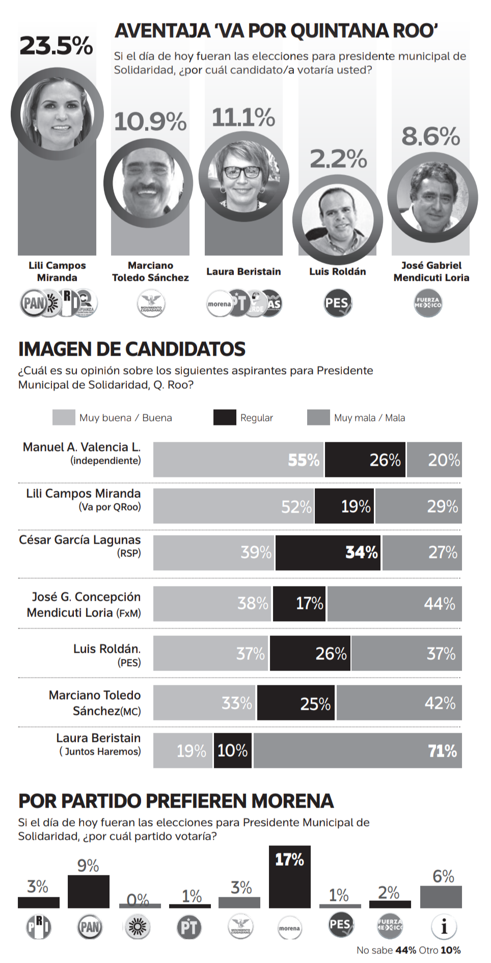 A tan solo nueve días de las elecciones intermedias en Quintana Roo, Lili Campos Miranda de la alianza PAN-PRI-PRD amplió las preferencias electorales en el municipio de Solidaridad al pasar de 22.9 por ciento el 31 de marzo a un 23.5 por ciento el 22 de mayo, sacándole casi el doble de ventaja a los abanderados de MC y Morena, que son los más cercanos.
