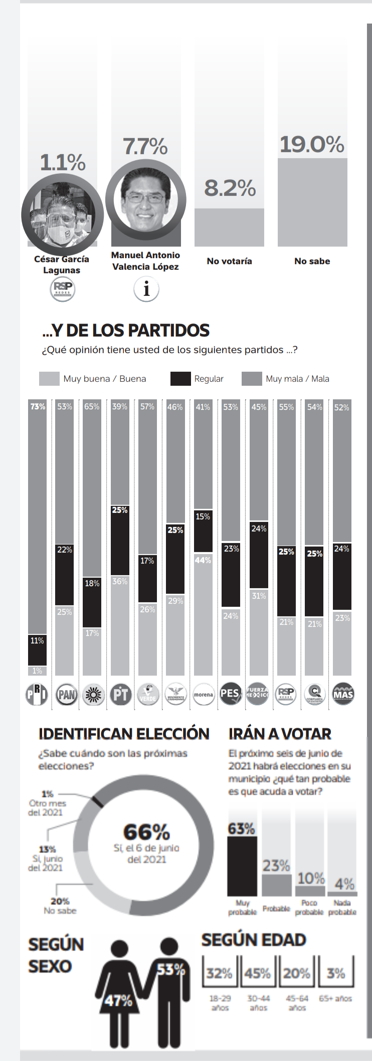Sobre la opinión que tienen los ciudadanos sobre los candidatos, la peor calificada es la alcaldesa con licencia, Laura Beristain de Morena, ya que un 71 por ciento considera que su imagen es muy mala y solo un 19 por ciento dijo que es muy buena; por el contrario de quien tienen la mejor opinión los encuestados es de Manuel Antonio Valencia López con un 55 por ciento que dijo que es muy buena y solo un 20 por ciento dijo que es mala; en tanto que quien encabeza las preferencias electorales, Lili Campos Miranda en este rubro, quedo en segundo lugar al tener el apoyo de un 52 por ciento de los ciudadanos que la consideran como muy buena.
