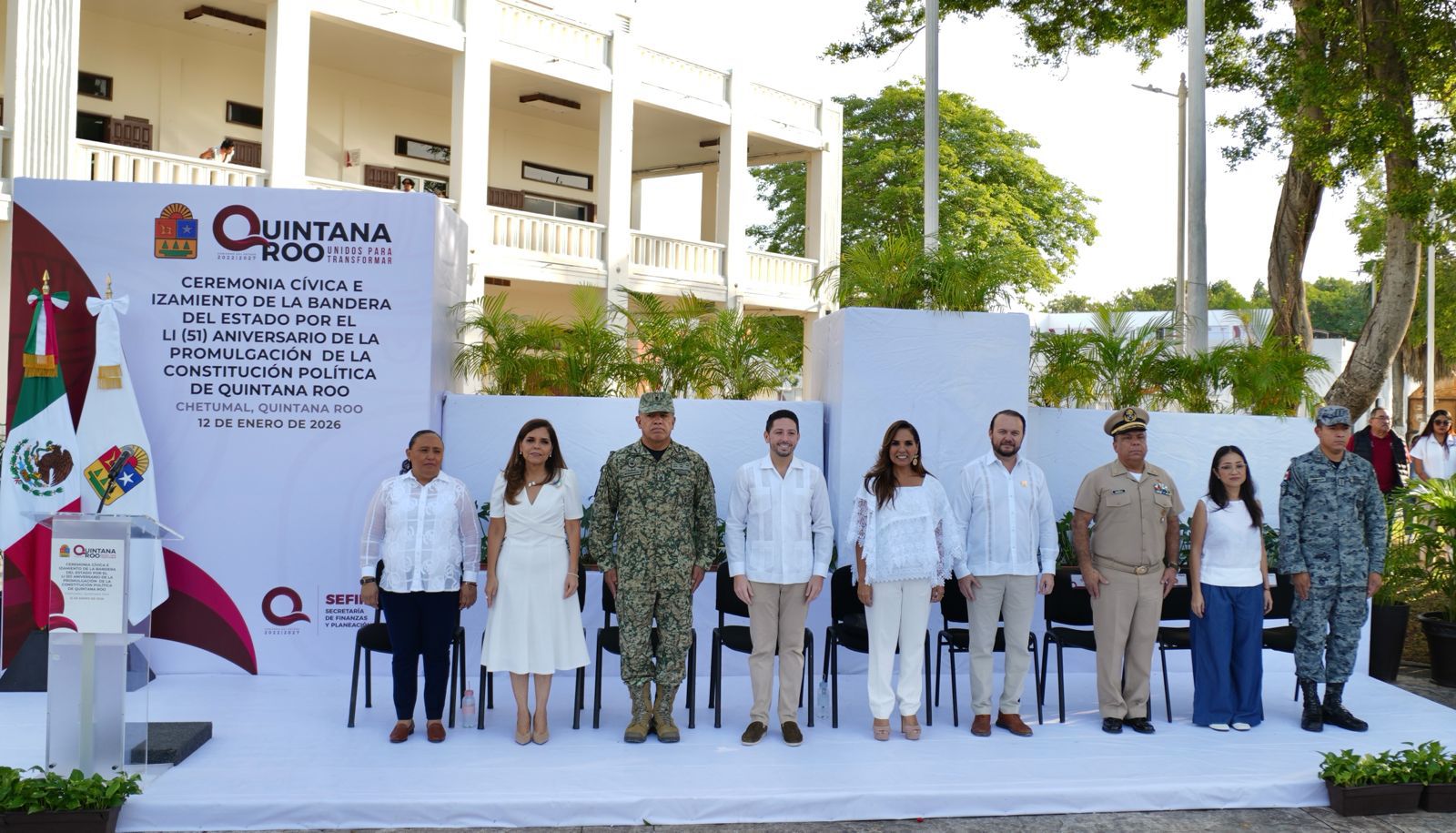 Chetumal.- En un acto encabezado por la gobernadora del estado, Mara Lezama Espinosa, se llevó a cabo la Ceremonia Cívica e Izamiento de la Bandera del Estado con motivo del 51 Aniversario de la Promulgación de la Constitución Política de Quintana Roo, donde el presidente del Congreso, Renán Sánchez Tajonar, destacó que la Constitución es el pilar que guía la transformación, la justicia y el bienestar de las y los quintanarroenses.