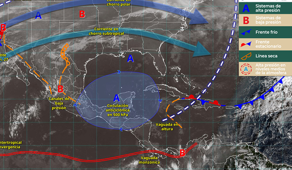 Finalmente, una circulación anticiclónica en niveles medios de la atmósfera mantendrá cielo despejado con baja probabilidad de lluvia en gran parte del territorio nacional; manteniéndose el ambiente frío a muy frío con posibles heladas al amanecer sobre entidades de la Mesa del Norte y la Mesa Central, así como cálido por la tarde.