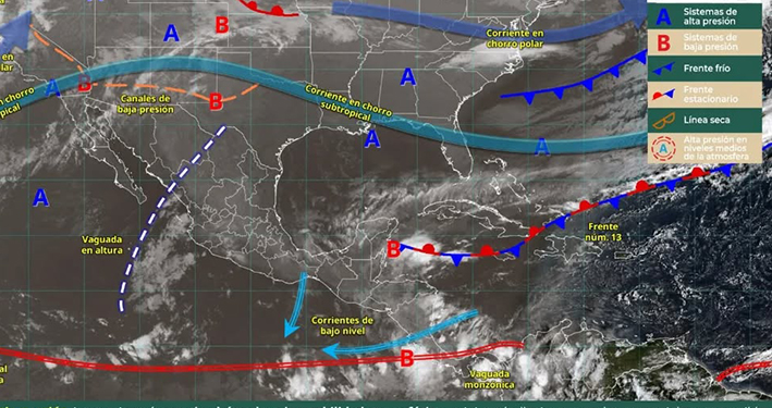 Por otra parte, se prevé durante la noche, se aproxime un nuevo frente frío al noroeste del país, asociado con una vaguada polar, una circulación ciclónica en altura y con las corrientes en chorro polar y subtropical, ocasionarán fuertes rachas de viento y lluvias aisladas en Baja California.