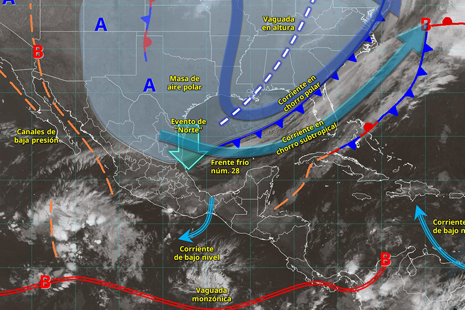 Además, el frente frío número 28 interactuará con una vaguada en altura sobre el Golfo de México, generando lluvias puntuales intensas en regiones de Chiapas, Tabasco y la Península de Yucatán.