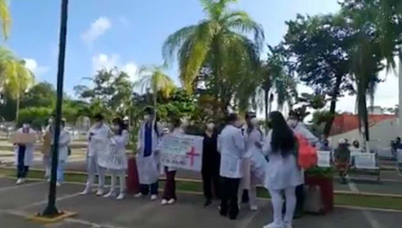 Con pancartas en mano, los más de 40 pasantes de medicina, también denunciaron que carecen de equipo de protección para atender a los pacientes covid-19; además demandan seguridad para sus compañeros que trabajan en comunidades rurales y que han perdido la vida por falta de equipo y han sufrido agresiones en cumplimiento de su deber.