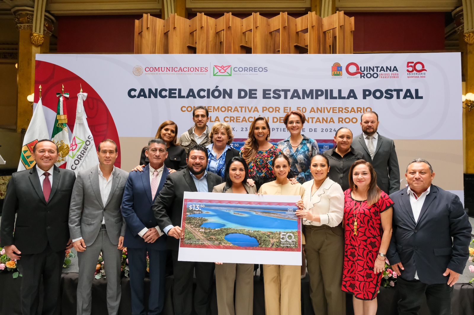 CIUDAD DE MÉXICO.- La gobernadora de Quintana Roo, Mara Lezama Espinosa, y la directora general del Servicio Postal Mexicano, Rocío Bárcena Molina, llevaron a cabo la cancelación de una estampilla postal conmemorativa, celebrando los 50 años de Quintana Roo como Estado Libre y Soberano. El evento tuvo lugar en el Palacio Postal de la Ciudad de México y contó con la participación de presidentes municipales.