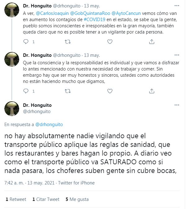 En ese sentido fueron los mensajes en contra del gobernador de Quintana Roo, quien ofrece un doble discurso, porque mientras pide a la gente que sigan todas las medidas sanitarias por el Covid-19, no hace nada por parar las fiestas masivas en Tulum, ni realizan operativos en el transporte público, mucho menos en la Zona Hotelera, y aunque los ciudadanos y turistas deben cumplir con los protocolos sanitarios, es responsabilizad del gobierno vigilarlas y aplicar medidas rigurosas para evitar que aumenten los contagios.