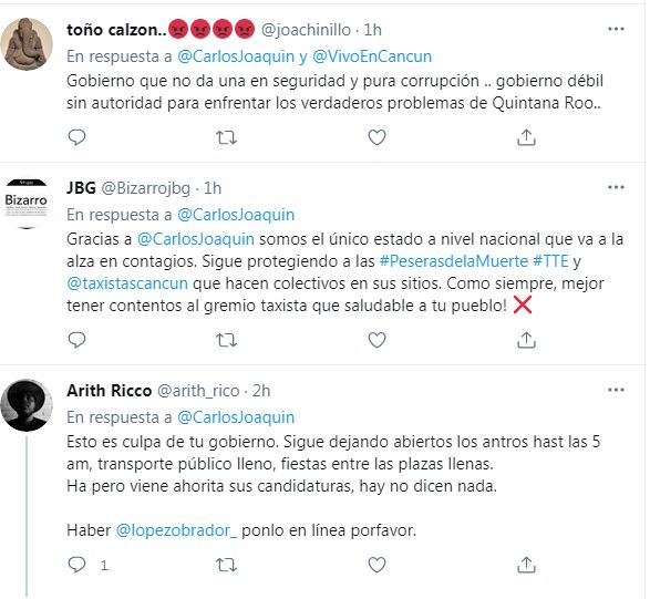 Por su parte, Laura Domínguez, le preguntó: “¿Y por qué nos quedamos en naranja debiendo de estar en rojo?” y Josué González, le respondió a Carlos Joaquín: “Y dejaste hacer los eventos de Zamna Tulum donde asistían miles de personas, era obvio que iba suceder esto. Ahora resulta”.