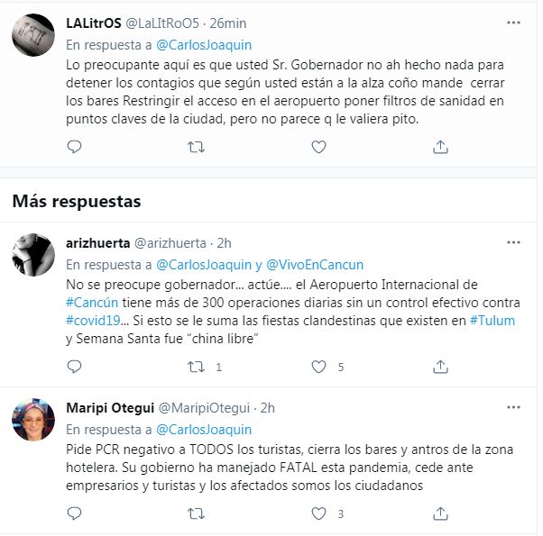 Por su parte, Laura Domínguez, le preguntó: “¿Y por qué nos quedamos en naranja debiendo de estar en rojo?” y Josué González, le respondió a Carlos Joaquín: “Y dejaste hacer los eventos de Zamna Tulum donde asistían miles de personas, era obvio que iba suceder esto. Ahora resulta”.