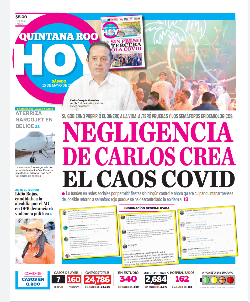 CANCÚN. Cientos de ciudadanos se mostraron indignados y le reprocharon en sus redes sociales al gobernador Carlos Joaquín González, que haya dejado el semáforo epidemiológico en naranja, cuando debió decretar el rojo debido a los contagios de Covid-19 que son muy altos y el estado es el único que no ha mostrado ningún descenso a nivel nacional.
