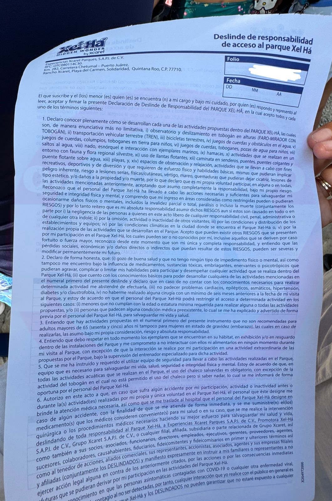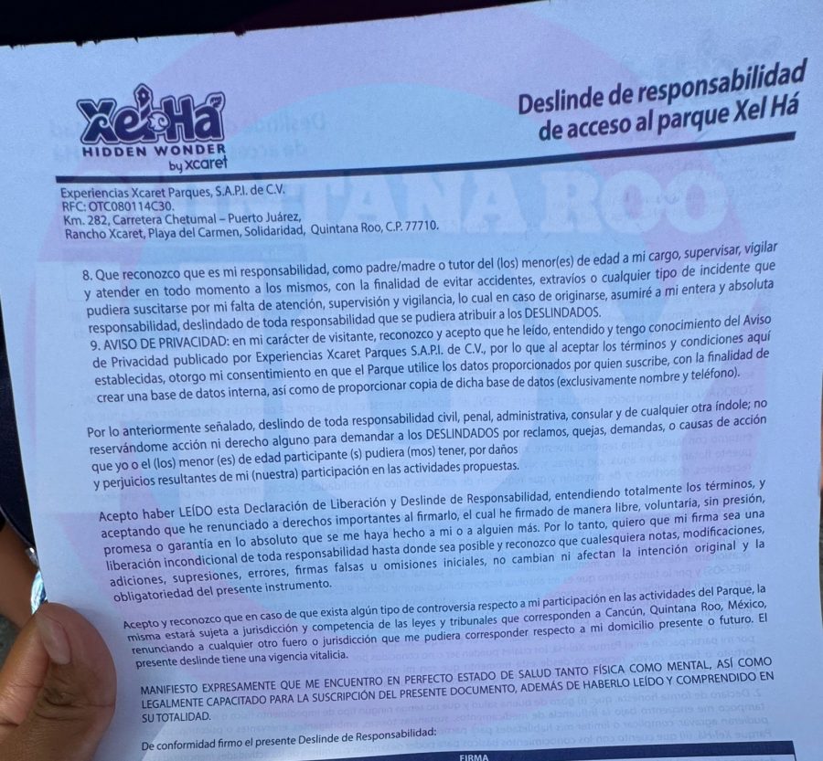 “Reconozco que el personal del Parque Xel-Há ha llevado a cabo las acciones necesarias y suficientes para salvaguardar mi seguridad e integridad física y mental, y comprendo que mi ingreso en áreas consideradas como restringidas pueden o pudieran ocasionarme daños físicos o mentales, incluidos la invalidez parcial o total, parálisis o incluso la muerte (conjuntamente los riesgos) y por lo tanto reitero que es mi absoluta responsabilidad asumir dichos riesgos aun si estos son causado en todo o en parte por i) la negligencia de las personas a quienes en este acto libero de cualquier responsabilidad civil, penal, administrativa o de cualquier otra índole”, expresa esta carta.