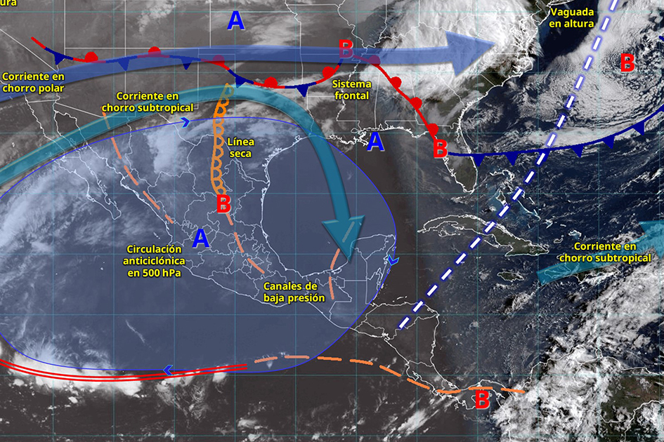 A nivel nacional, el anticiclón sigue dominando gran parte del país, provocando temperaturas extremas en múltiples estados, mientras en el noreste se combinan sistemas que generan lluvias, ráfagas intensas y posibles torbellinos.