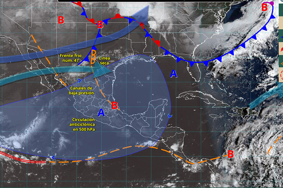 En contraste, el frente frío número 47 avanza sobre el norte del territorio nacional, donde interactúa con otros sistemas, generando lluvias, descargas eléctricas y posible granizo en esas regiones.