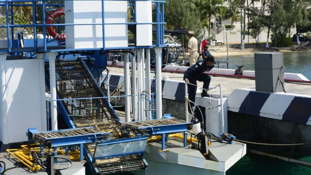Isla Mujeres. – Como parte de la estrategia conjunta del gobierno de Quintana Roo que encabeza Carlos Joaquín y la Marina Armada de México para mantener las playas libres de sargazo, este martes arribó a las costas del Caribe mexicano el buque sargacero costero ARM “FLUITANS” (BSC-201).