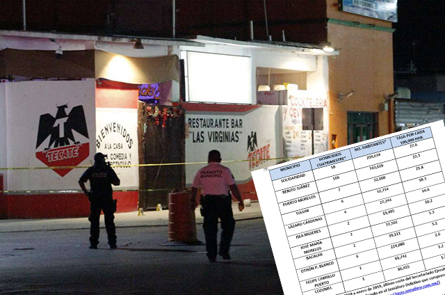 La situación es la siguiente: Solidaridad, 27.6 asesinatos por cada 100 mil habitantes; Benito Juárez, 22.3 y Puerto Morelos, 21.8. Solidaridad tiene menos habitantes que Othón P. Blancol, (224 mil 080), donde en contraste, se registraron sólo 6 asesinatos. (Carlos Calzado c./Grupo Cantón)