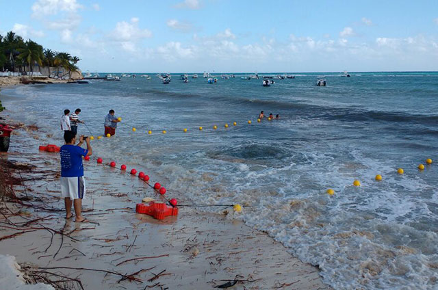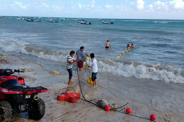 PLAYA DEL CARMEN.- En cumplimiento a las instrucciones de la Presidenta Municipal de Solidaridad, Cristina Torres Gómez, la Dirección de Zona Federal Marítimo Terrestre (Zofemat) encabezada por Hugo Uribe Nicolás, colocó boyas alrededor del socavón que apareció en la playa ubicada al final de la avenida CTM.