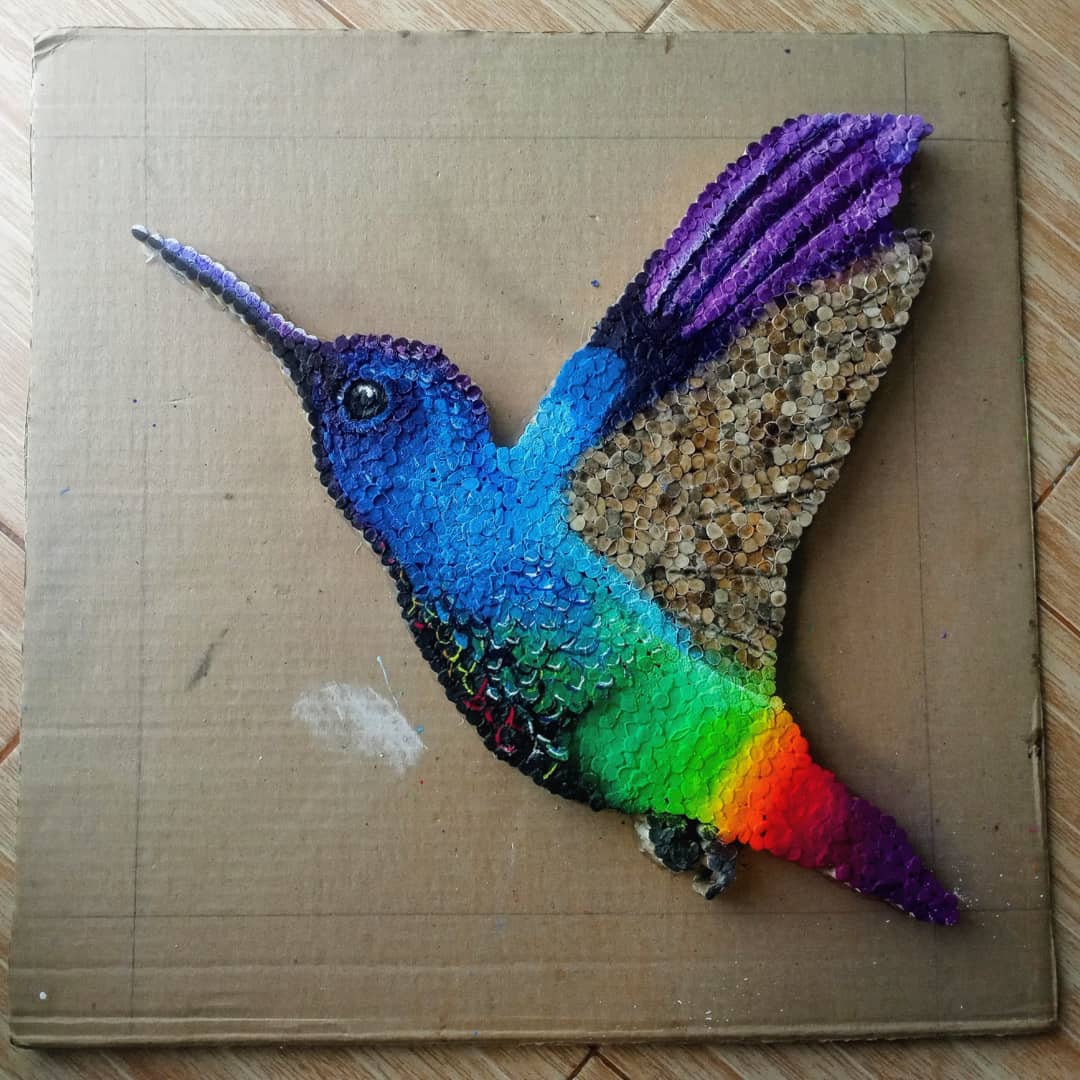 Actualmente ya recolectó 18 mil 869 colillas de cigarro, y las convirtió en cuatro pinturas. La primera fue una mandala y la última un colibrí. Tarda un mes aproximadamente en terminar cada obra.