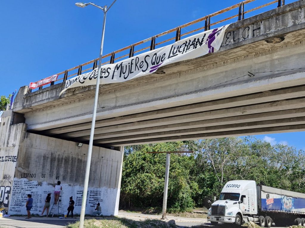 Playa del Carmen.- En el marco del Día Internacional de la Mujer, el colectivo “Siempre Unidas” pintó un mural en el puente de la avenida Colosio con Ciruelos, a espaldas del fraccionamiento Villas del Sol, con los nombres de varias personas desaparecidas.
