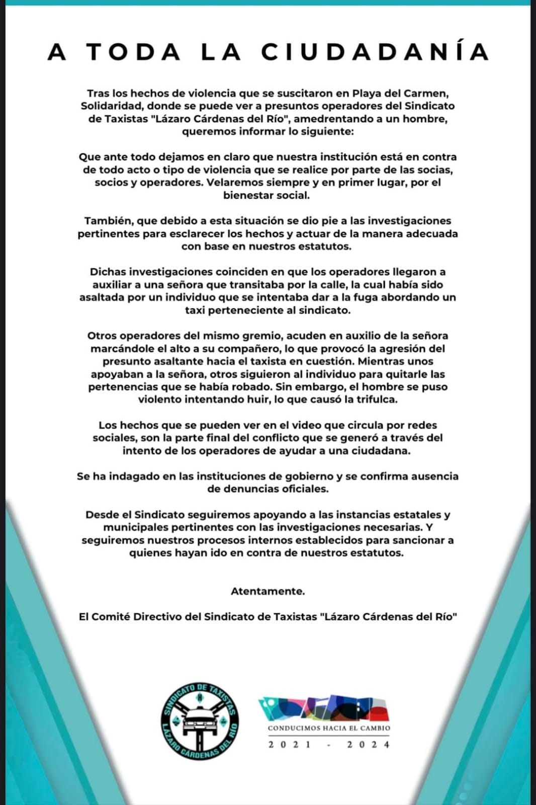 Playa del Carmen.- Luego de la difusión de un video en donde captan a unos taxistas dándole una brutal golpiza a un hombre. Esta tarde, el Sindicato de Taxistas “Lázaro Cárdenas del Río”, a través de un comunicado oficial, aseguró que este acto fue justificado, ya que la persona agredida presuntamente había asaltado a una mujer, momentos antes.