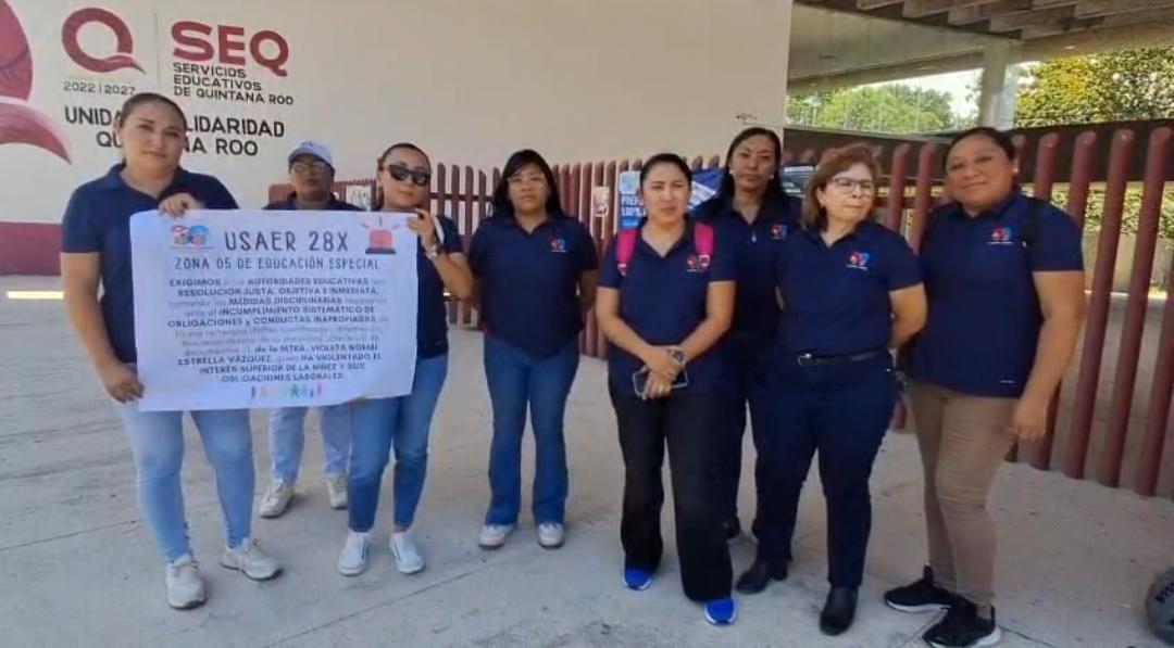 Playa del Carmen.- Personal docente de la Unidad de Servicios de Apoyo a la Educación Regular (USAER) 28X se manifestó este miércoles en las oficinas de la Secretaría de Educación de Quintana Roo (SEQ) en Playa del Carmen, para exigir la destitución de una maestra del área académica, a quien señalan por presunto incumplimiento de funciones.