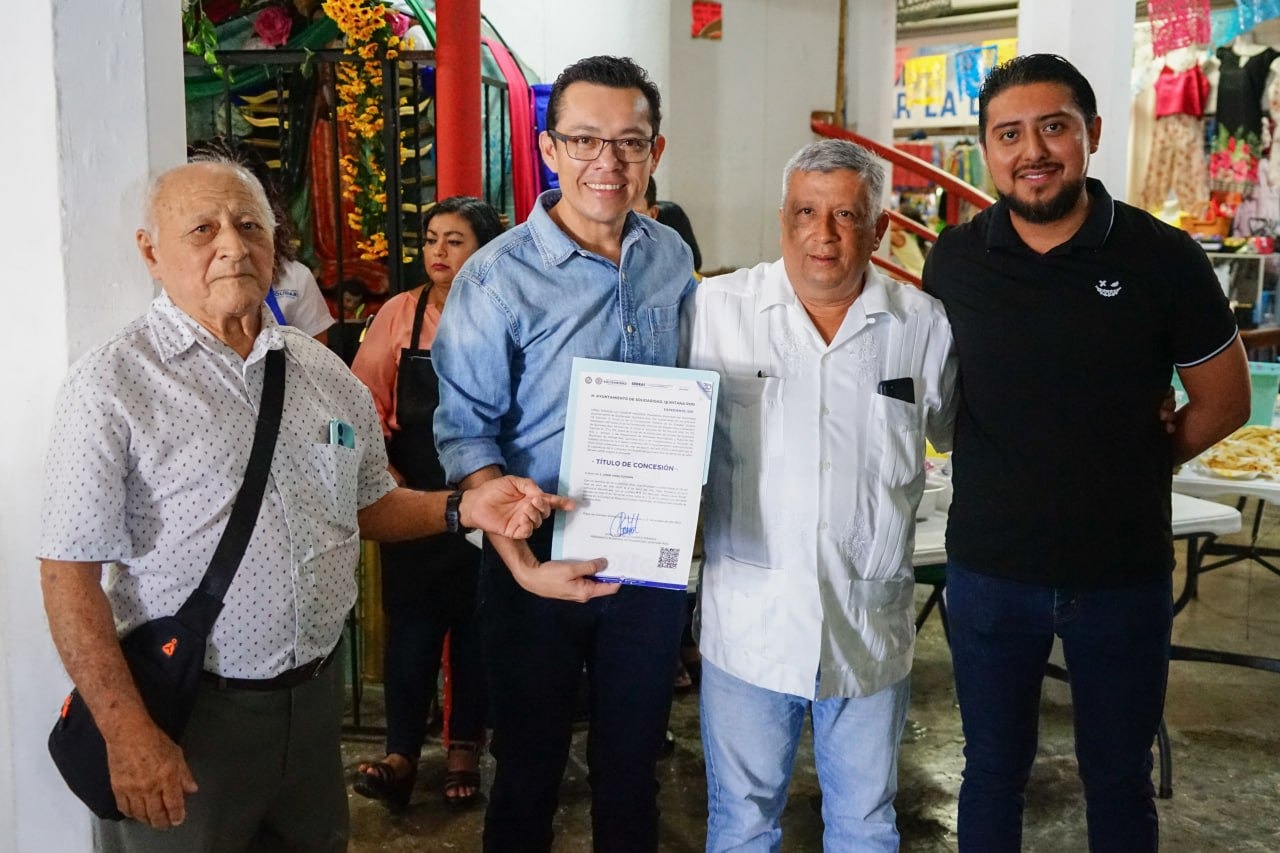 El secretario de Desarrollo Económico y Atracción de Inversiones, Raúl Aguilar, acompañado del director de Mercados, Alonso Salazar y el presidente de los locatarios, Rudi Pérez, entregó las concesiones en este centro de abasto popular inaugurado en el año 2005.