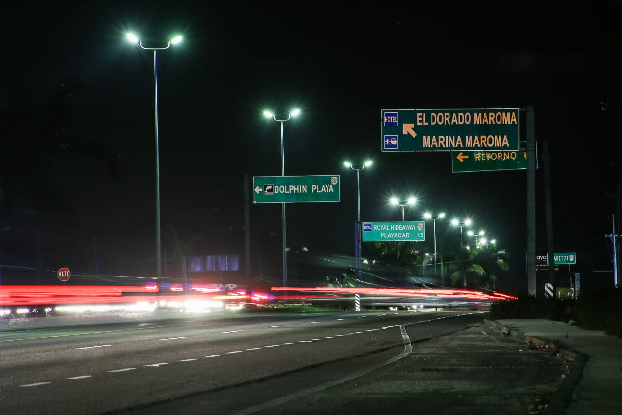 En este momento, el Ayuntamiento de Solidaridad rehabilita el alumbrado de la carretera federal al sur de Playa del Carmen rumbo al municipio de Tulum, donde se presenta un avance hasta el tramo de Punta Venado.