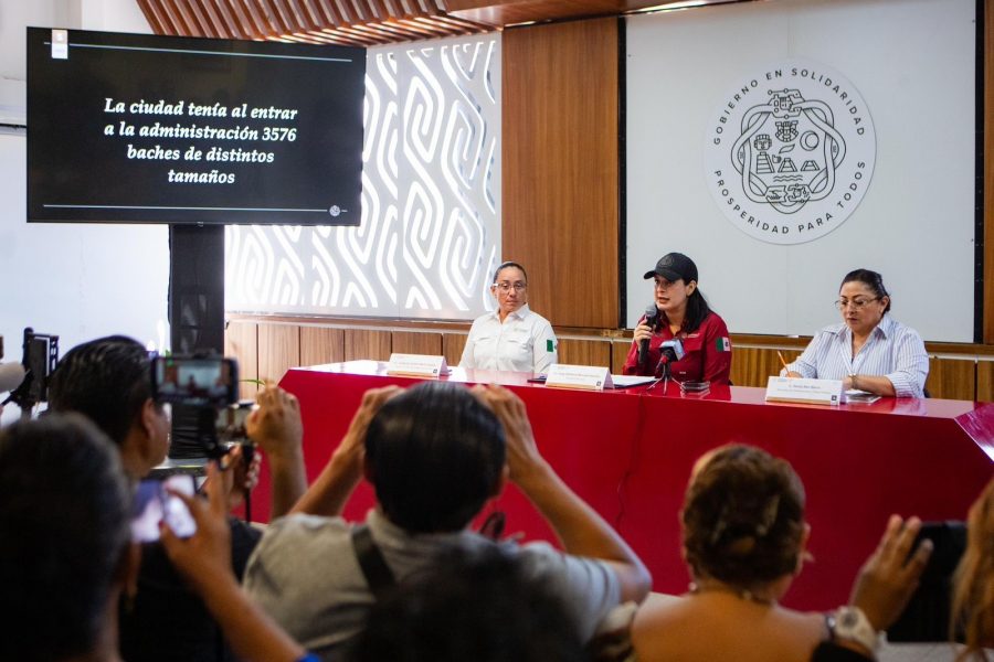 Acompañada por las secretarias de Servicios Públicos y de Infraestructura y Obras Públicas, Julieta Martín y Doris Aké, respectivamente, agregó que se han logrado censar 3 mil 576 baches en toda la ciudad.