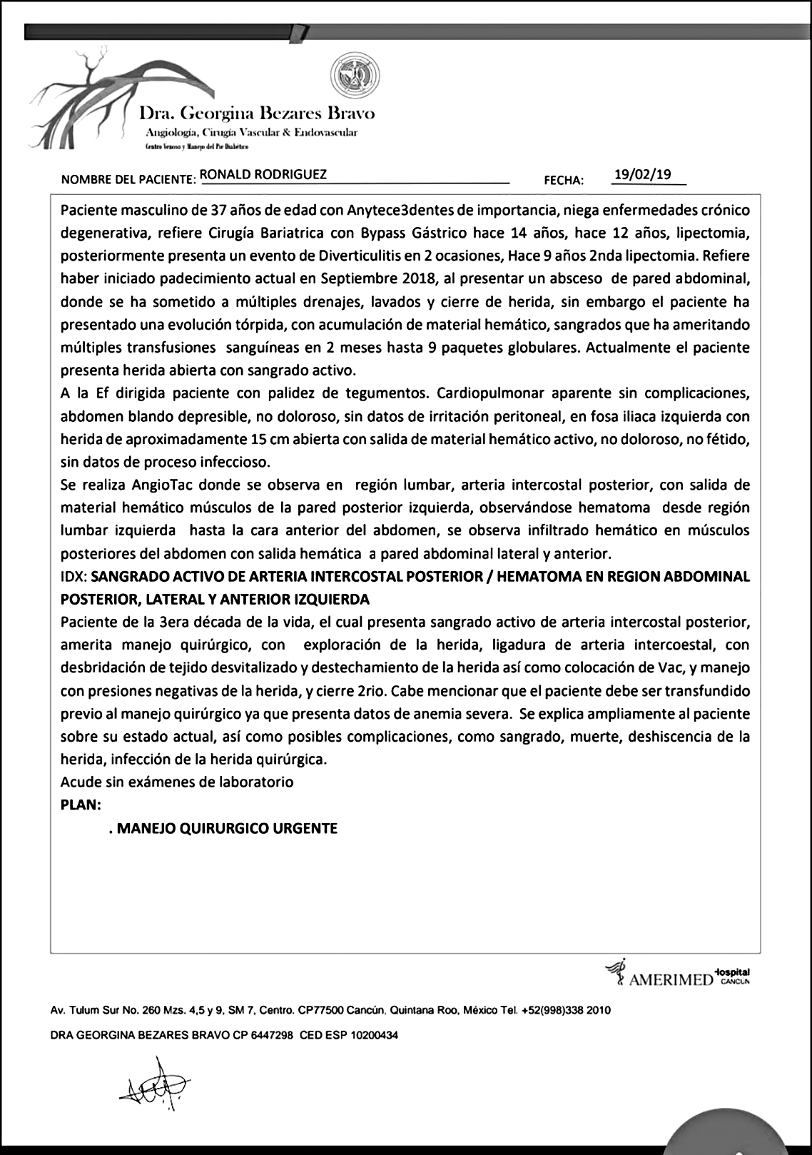 “Se realiza AngioTac donde se observa en región lumbar, arteria intercostal posterior, con salida de material hemático músculos de la pared posterior izquierda, observándose hematoma desde región lumbar izquierda hasta la cara anterior del abdomen”, agrega el informe. Entre las posibles complicaciones, incluso se encuentra la muerte, concluyen.
