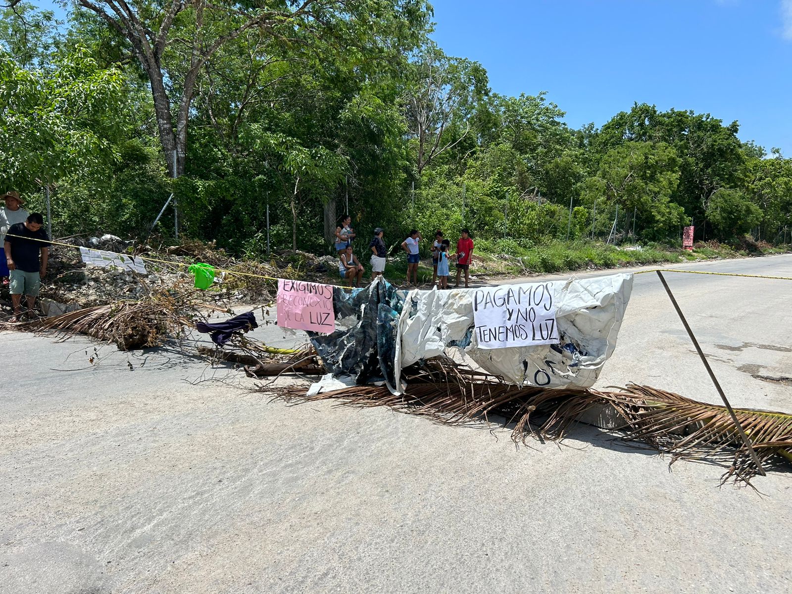 Con piedras y palos, los vecinos iniciaron este bloqueo a la altura de la calle Bahía de Plenity, para después tender un lazo en donde colocaron sus recibos de pago de la CFE.