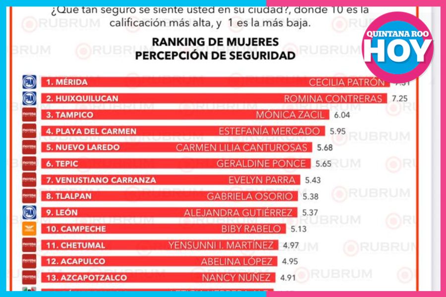 Playa del Carmen,— De acuerdo con la empresa encuestadora Rubrum, en su más reciente evaluación nacional de alcaldesas (septiembre 2025), Playa del Carmen se ubicó en el 4º lugar nacional en percepción de seguridad, consolidándose como uno de los municipios más seguros del país bajo el liderazgo de la presidenta municipal Estefanía Mercado.