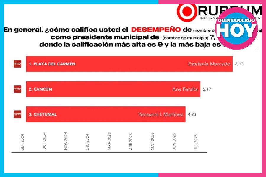 Playa del Carmen.– La presidenta municipal de Playa del Carmen, Estefanía Mercado, lidera nuevamente la aprobación ciudadana en Quintana Roo, al posicionarse como la mejor evaluada en cuatro de los principales indicadores de desempeño gubernamental, de acuerdo con la más reciente encuesta de Rubrum, realizada entre el 1 y 5 de julio de 2025.