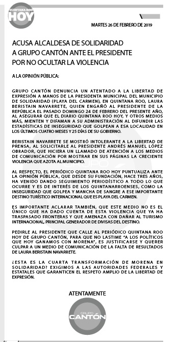La edil de Solidaridad buscó eludir su deficiente trabajo al frente de la Comuna, al afirmar que los medios de comunicación en Quintana Roo están acostumbrados a que las páginas sean pagadas de a uno o dos millones de pesos: “sino pagas, te dan de golpes, no solo a uno, sino al estado y a todos los municipios. Le pasa a Cancún, Puerto Morelos, Solidaridad, todos los días me pone el grupo Cantón, Solidaridad 100 días de sangre, esto no es verdad y afecta al país y a la Cuarta Transformación, de la cual formo parte desde hace 20 años”, aseguró.