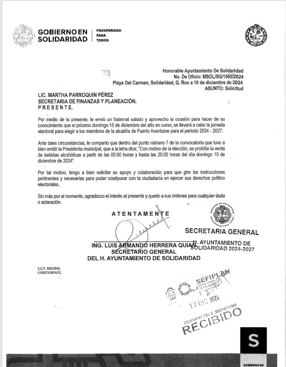 Playa del Carmen, Quintana Roo, 14 de diciembre de 2024.- El secretario general del Ayuntamiento, Luis Herrera Quiam, informó que este domingo 15 de diciembre quedará suspendida la venta de bebidas alcohólicas en Puerto Aventuras, con motivo de la jornada para elegir a los miembros de la Alcaldía para el periodo 2024-2027.