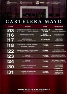 En cuanto a los shows de la iniciativa privada, “México Mágico” con la escuela de danza Le Blanc este 17 de mayo; “Carmen, porque somos todas”, el día 22 del presente; los días 23 y 24 se podrá disfrutar de “Thi is me”, mientras que la comunidad educativa “El Papalote” presentará el teatro musical “La fábrica de Chocolate” el 30 y 31.