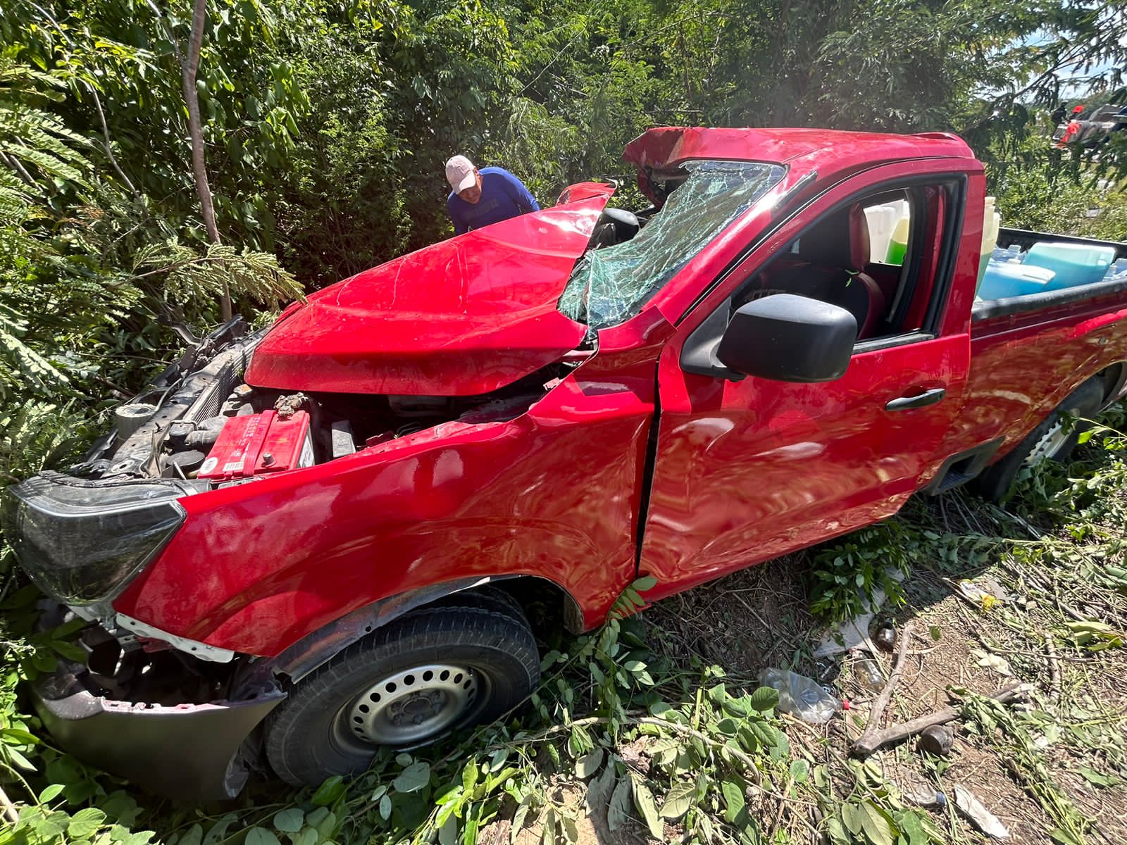 A consecuencia de esto, ambos vehículos terminaron a un lado de la carretera, entre la maleza, pero sólo uno terminó aparatosamente volcado.