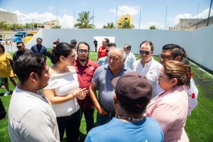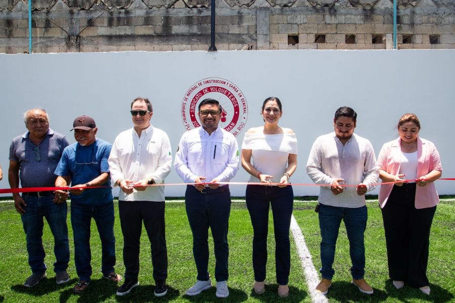 Playa del Carmen.- La presidenta municipal Estefanía Mercado encabezó la inauguración de una cancha de fútbol 7 y otra de básquetbol en el emblemático Sindicato de Volqueteros “José Quiam Chan”, uno de los más antiguos de Playa del Carmen y símbolo del trabajo colectivo que hoy se suma a la construcción de paz y prosperidad que encabeza su gobierno.